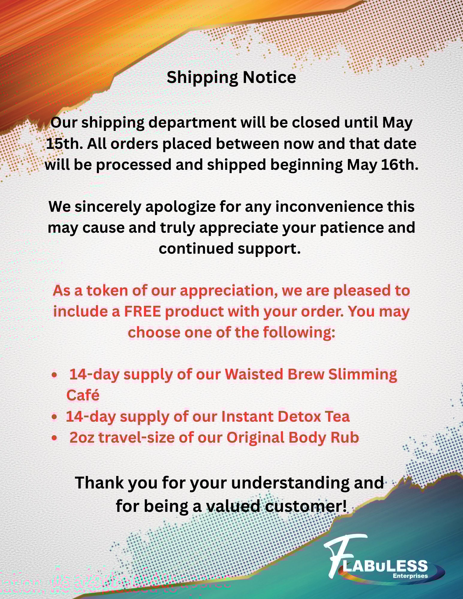 We sincerely apologize for any inconvenience this may cause and truly appreciate your patience and continued support. As a token of our appreciation, we are pleased to include a FREE product with your order.